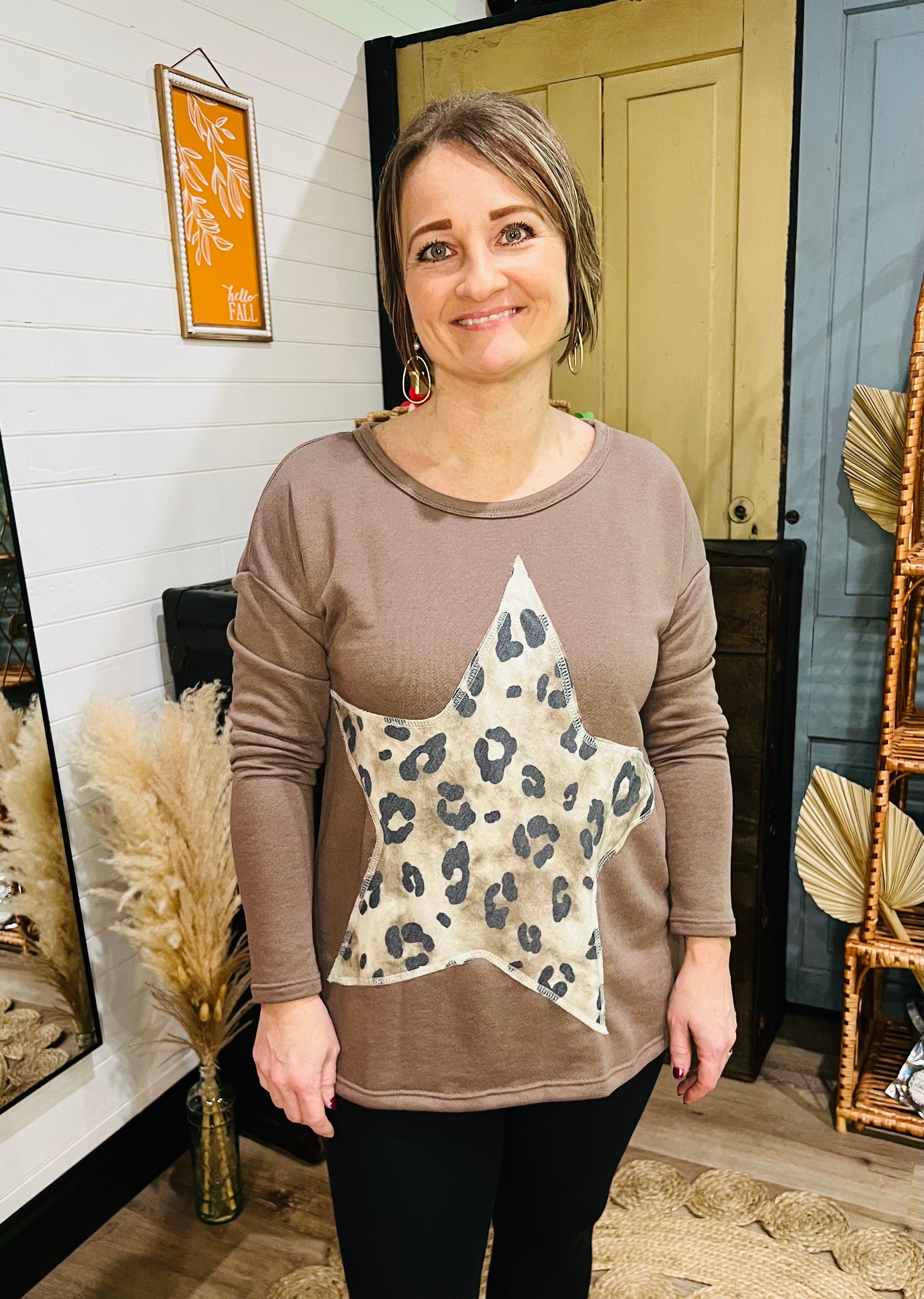 This round neck, long sleeve top could be worn casually with a pair of our leggings and a white tennis shoe, or easily dressed up with a pair of our gorgeous distressed jeans and our ankle booties! The animal print star patch is what MAKES the shirt!!