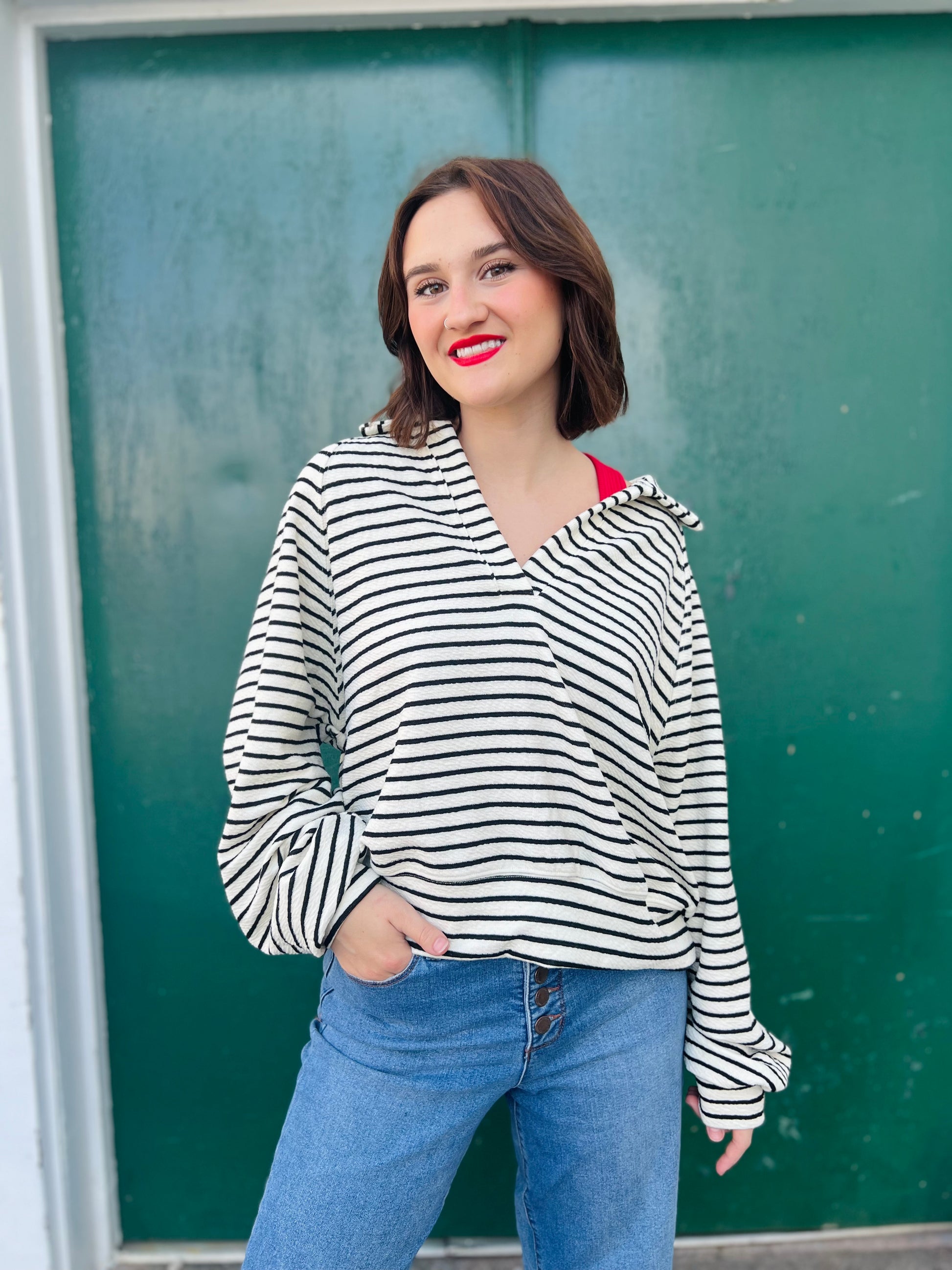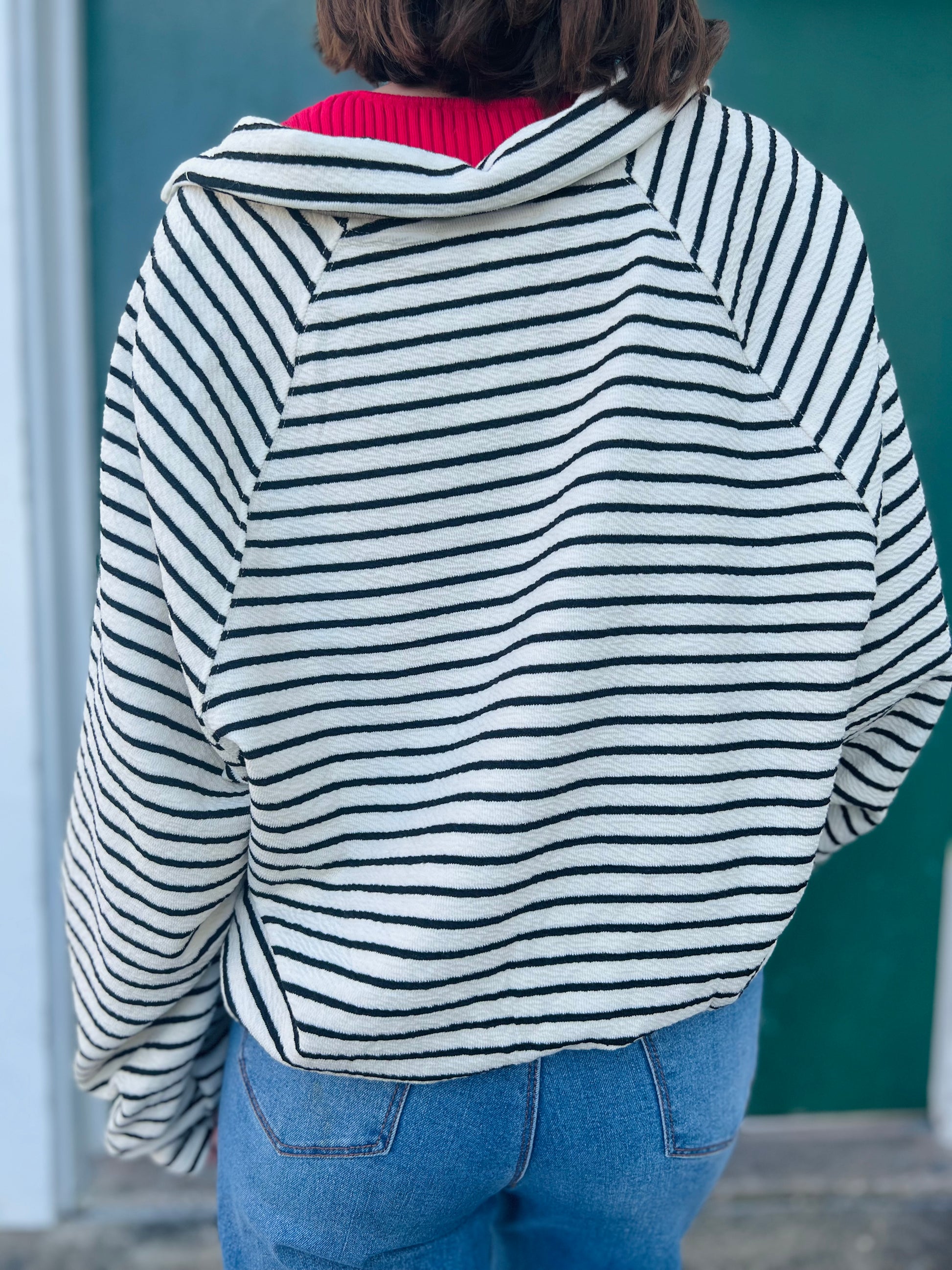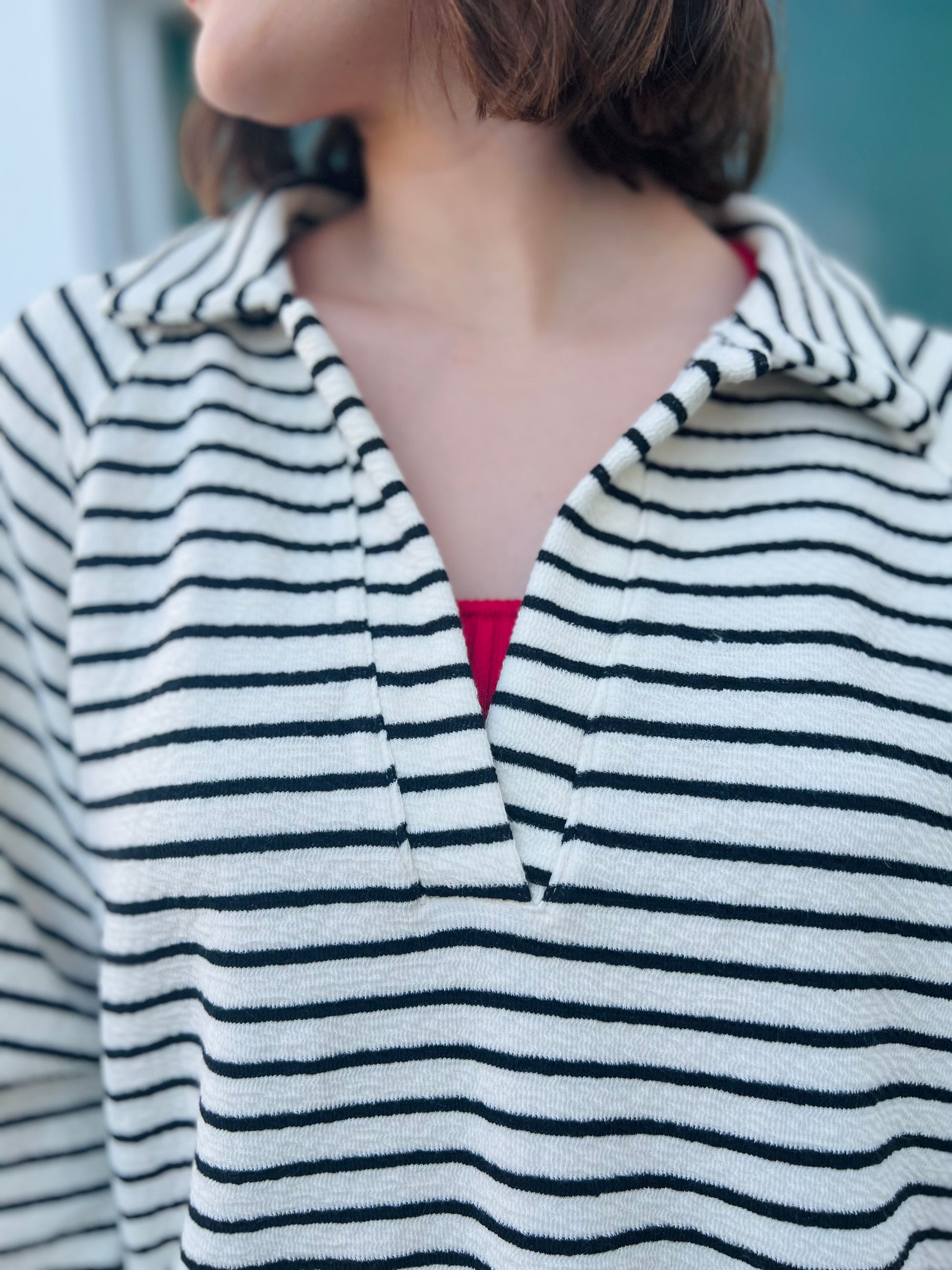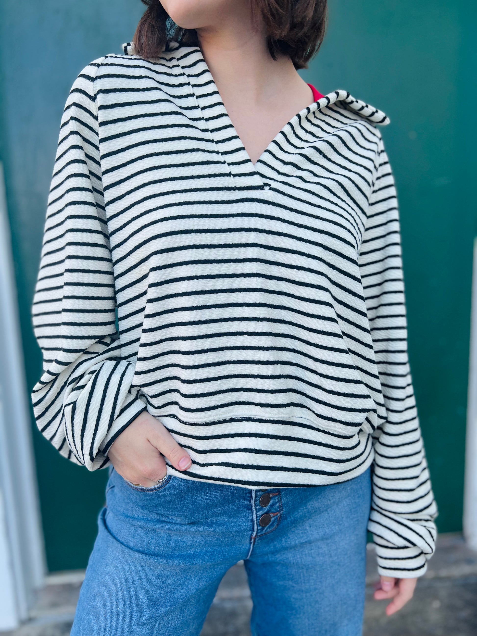 Cozy up in this Striped Pullover, featuring a collar and relaxed fit. The vertical stripes add a touch of chic Too this comfortable piece, making it perfect for lounging.