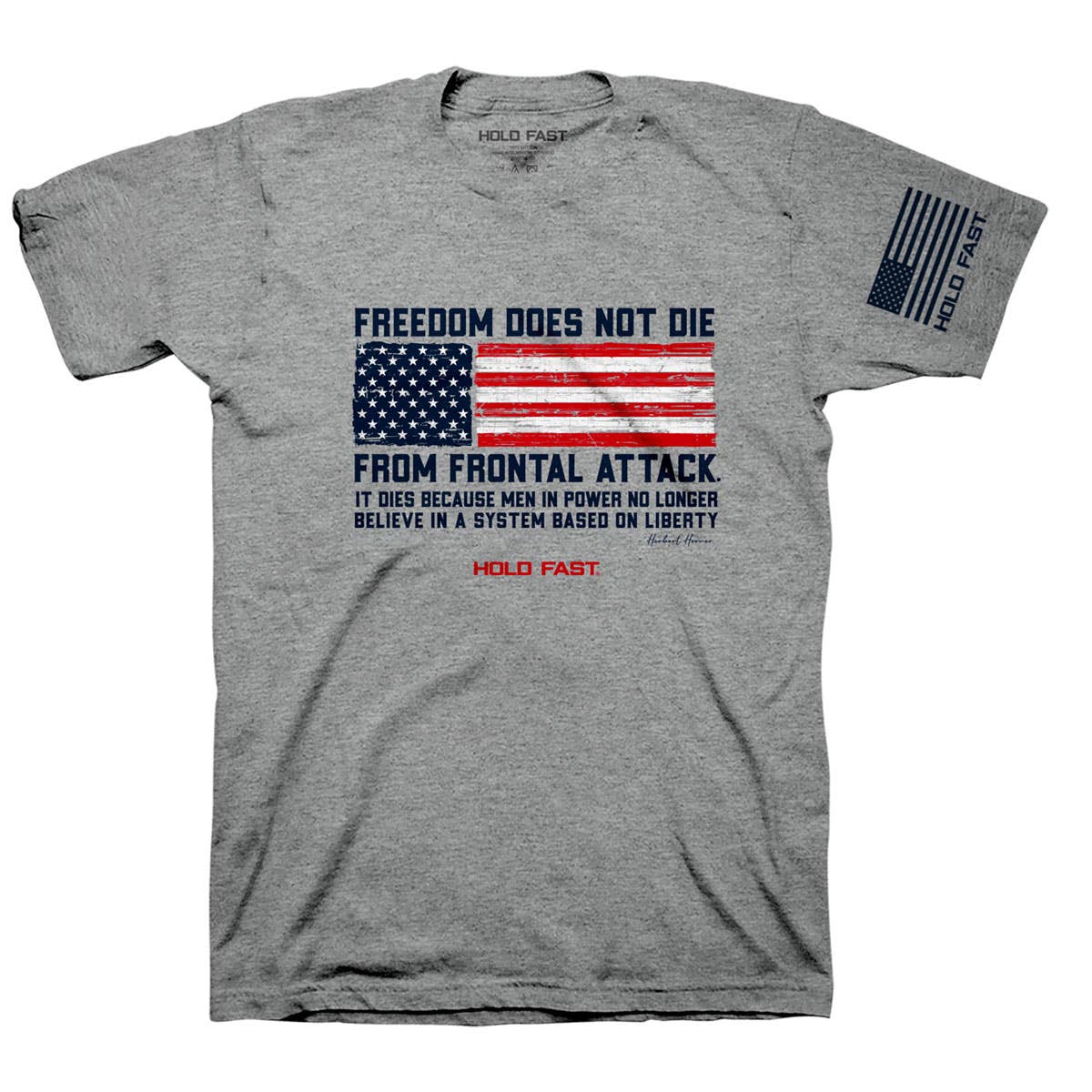 Boldly declare your faith in our American freedom in this patriotic “Frontal Attack” T-shirt by HOLD FAST® in Athletic Heather. Our nation was founded on democratic principles and the ideal of individual freedom, and we have a responsibility to stand up for what we believe in, and protect the values we hold dear.