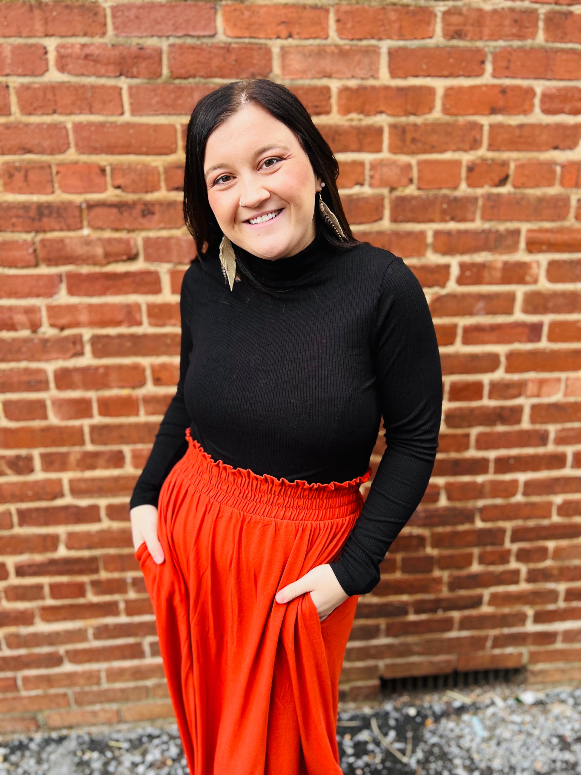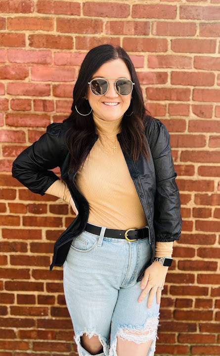I feel like everyone needs a basic tight long sleeve in their closet! These beauts pair perfect under a graphic tee in the winter time, a sweater vest, or you can even wear it as a regular top with a pair of our comfy joggers! Haley paired the Khaki top with our Lavish Faux Leather Jacket for a retro look.