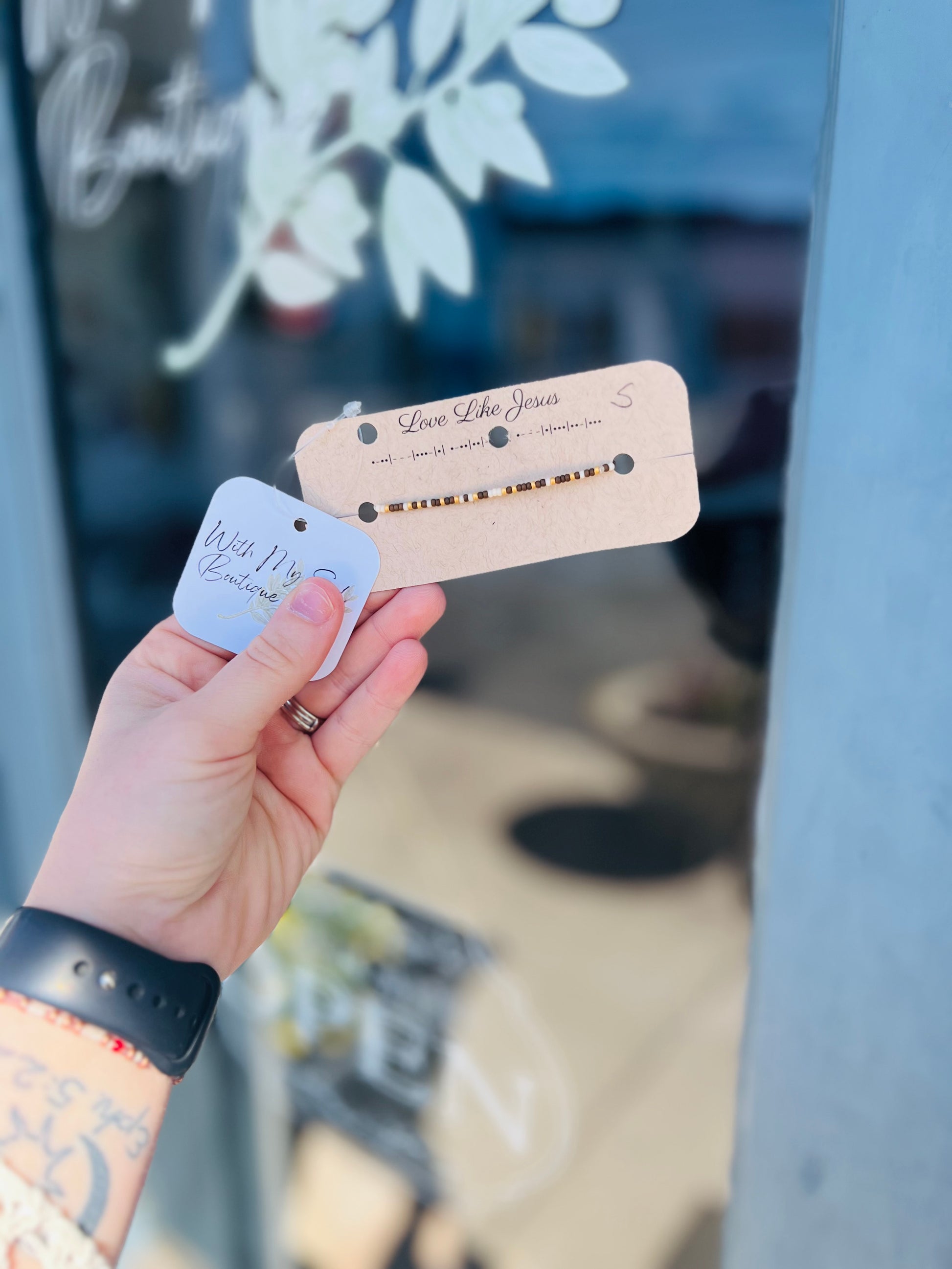 This meaningful message is translated through international Morse code. Each bead color represents the the dashes dots and spaces. 2mm beads are strung on quality elastic and the bracelet is secured with a knot and glue.