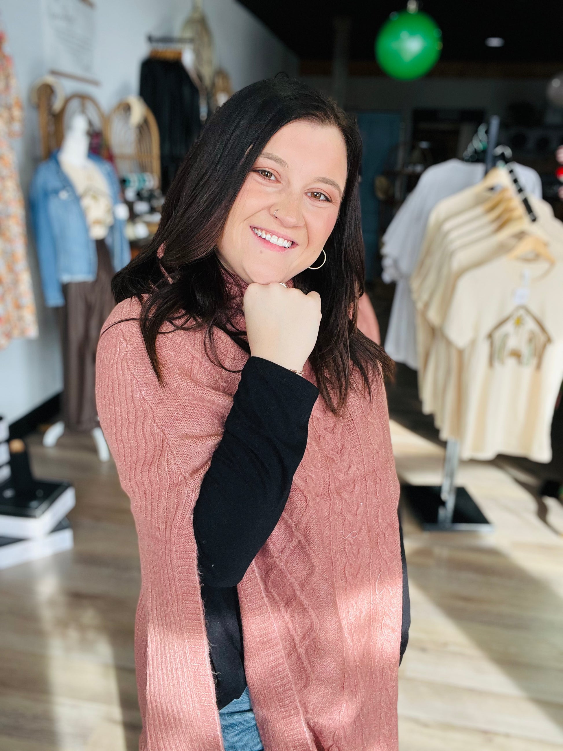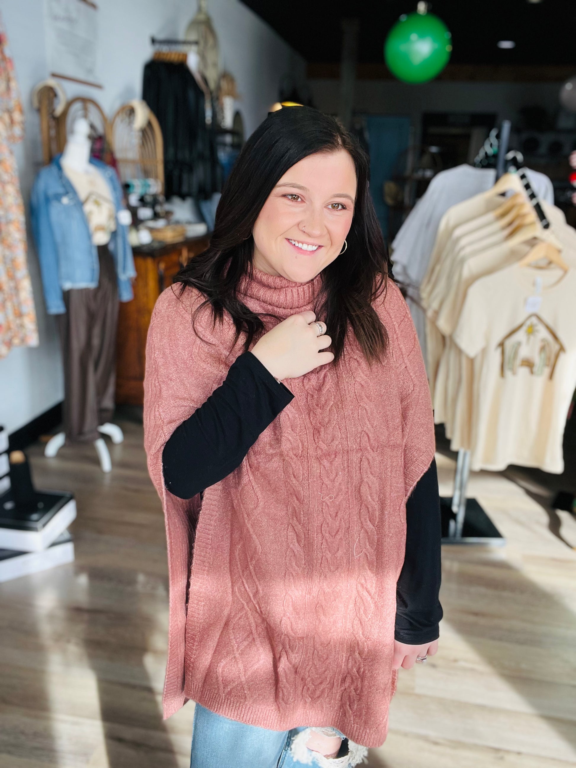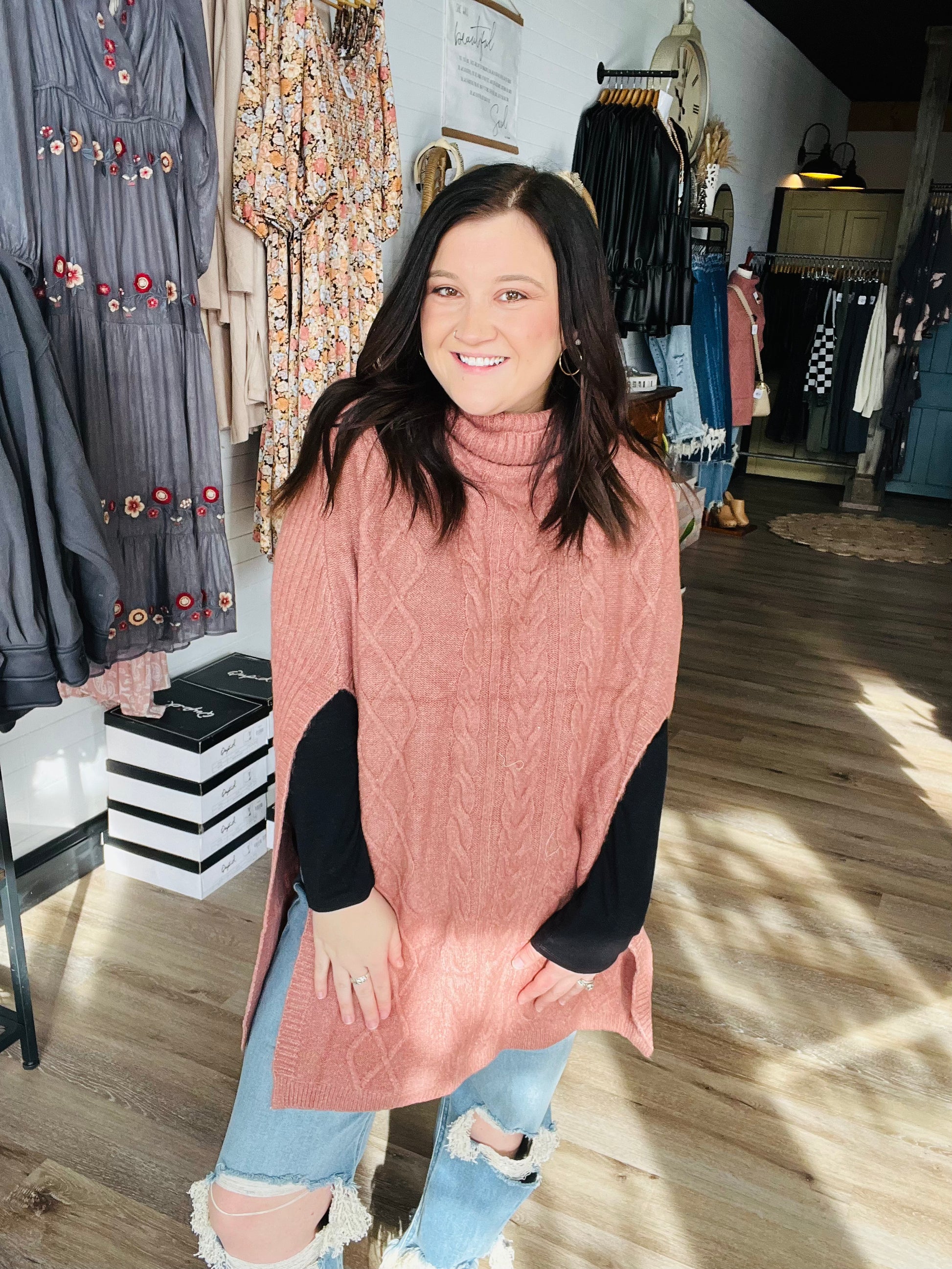 Turtle neck cable tie knitted poncho sweater top -turtle neck -cable tie pattern knitted -poncho style -loose fit casual
