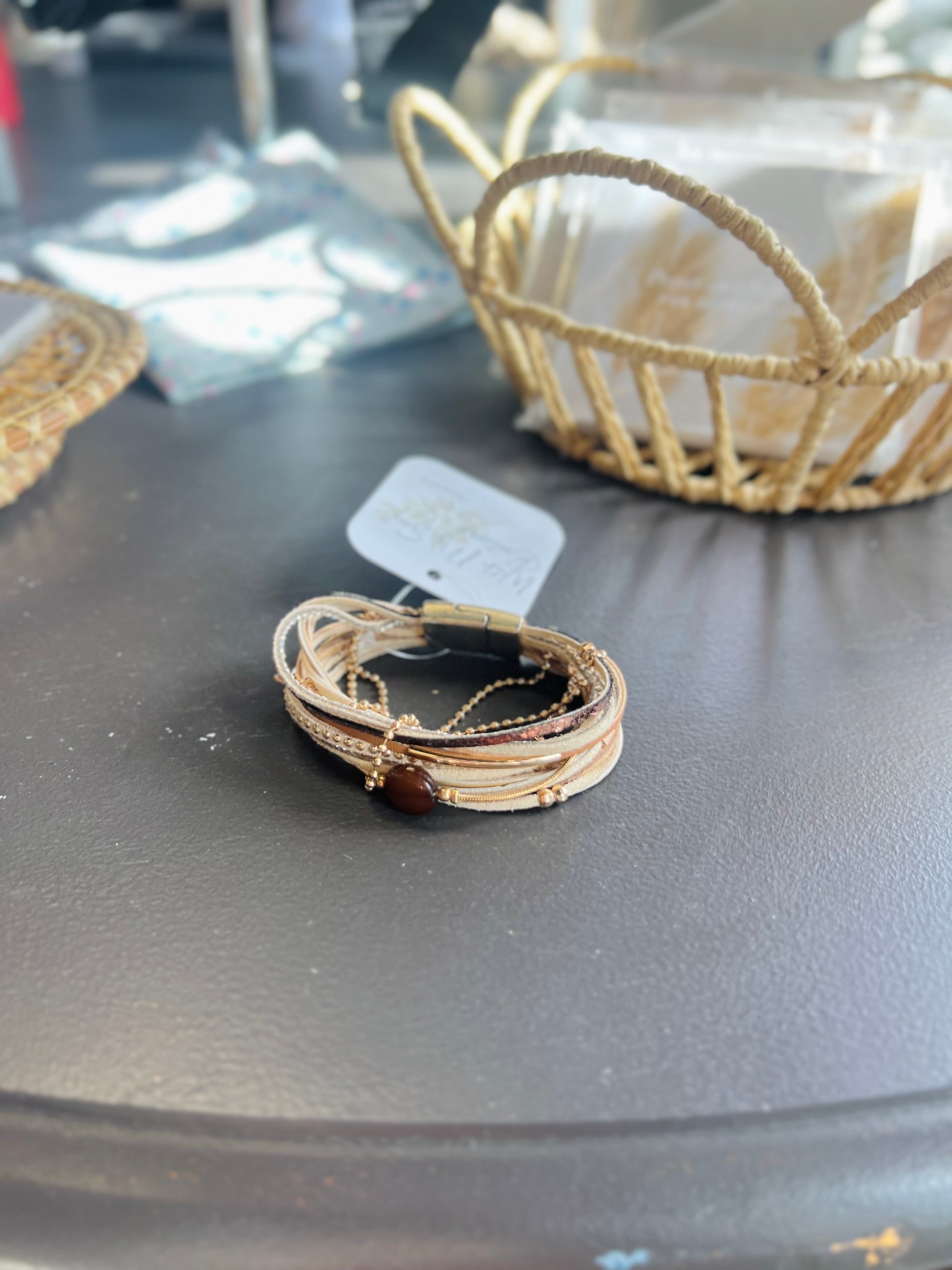 Multi Strand Beige Bracelet W/ Brown Pendent