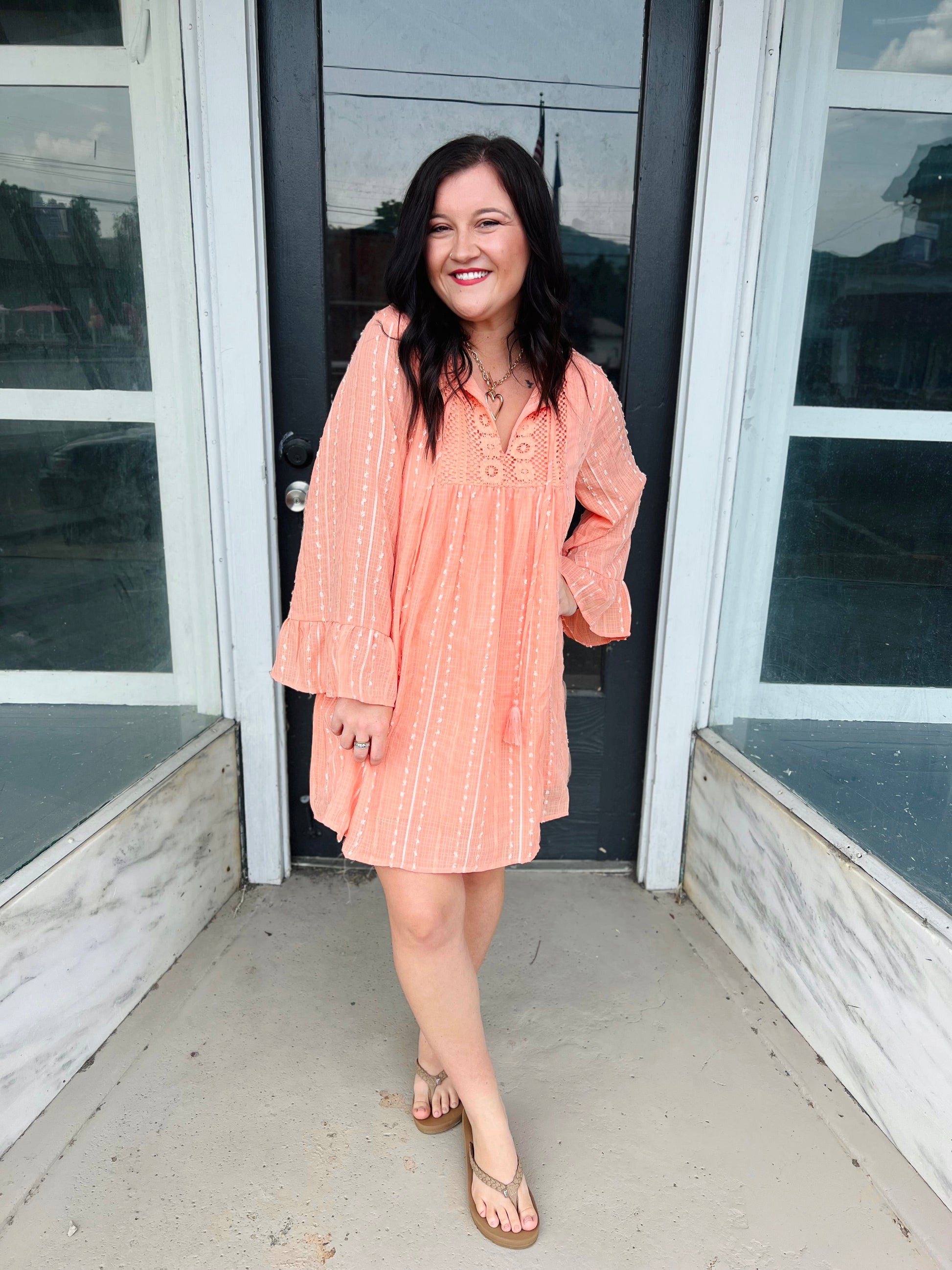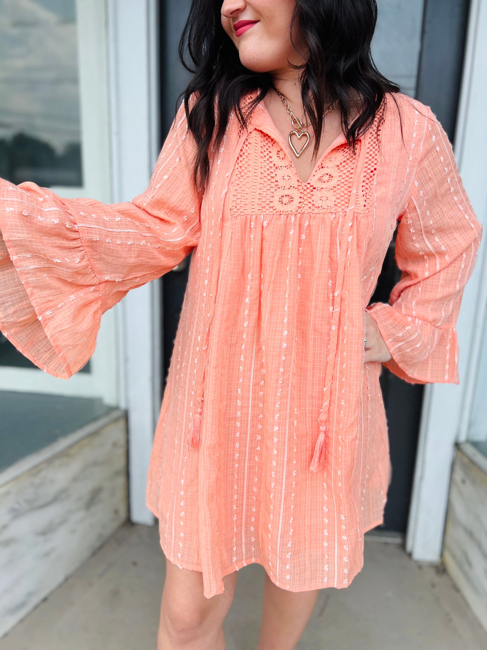 The Adina | Mini Dress is perfect for date night out, wedding guest dress, beach trip, or just a casual day at work! Features 3/4 bell sleeves with a front tie for a lovely casual summer style!