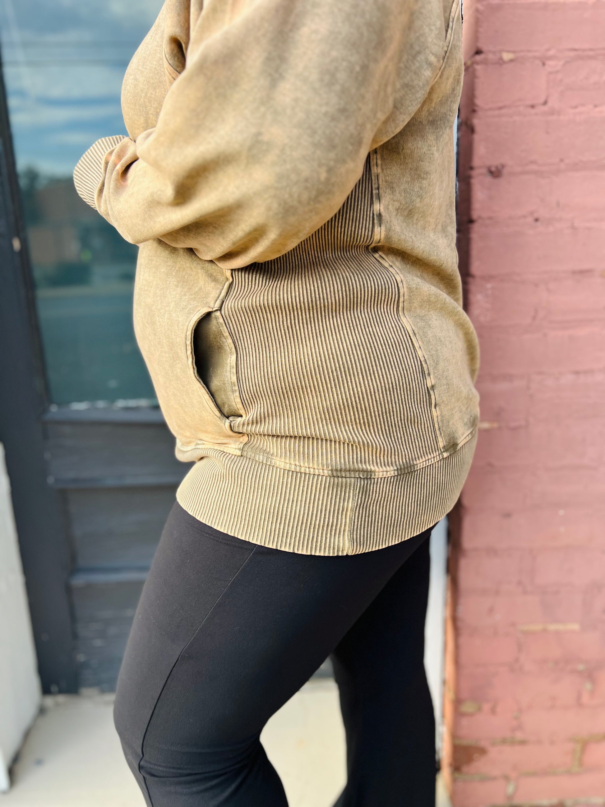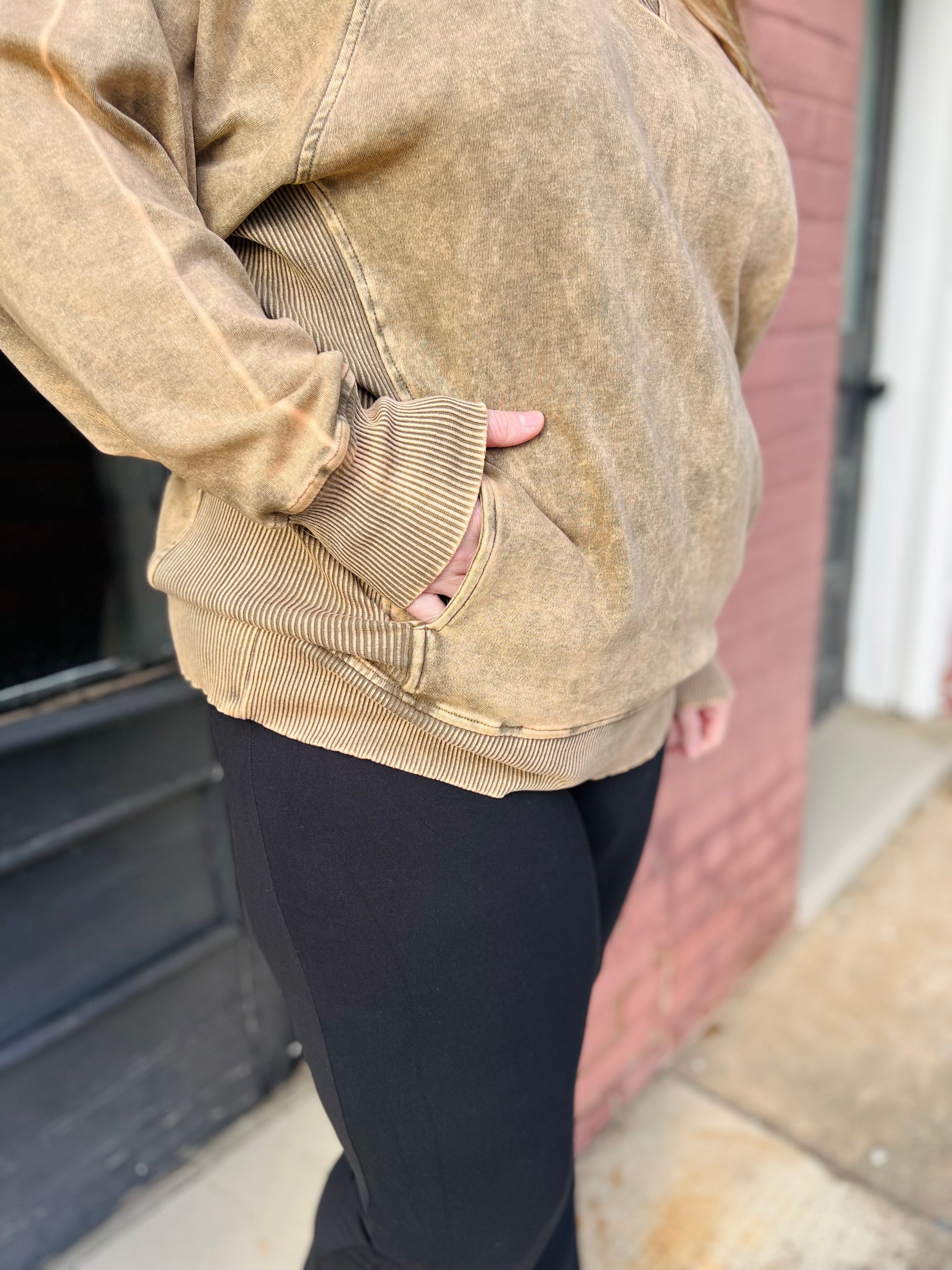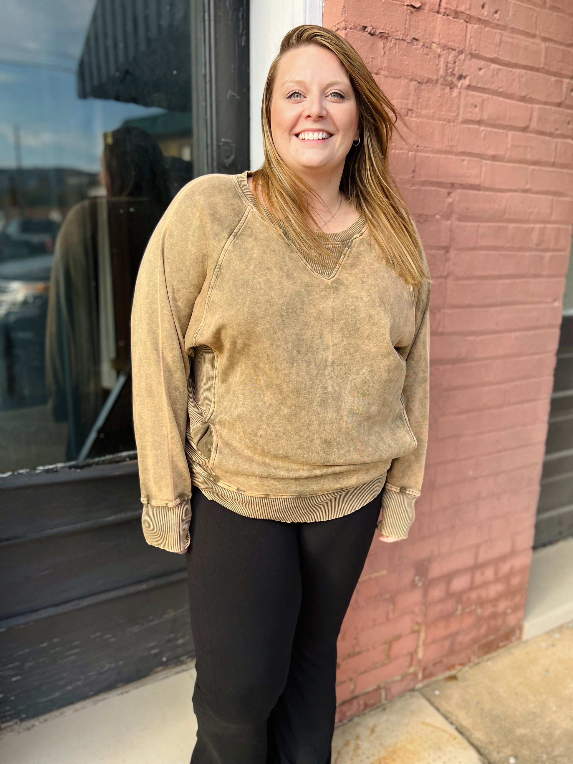 Curvy Acid Wash Round Neck Pullover With Pockets - RIBBED DETAIL