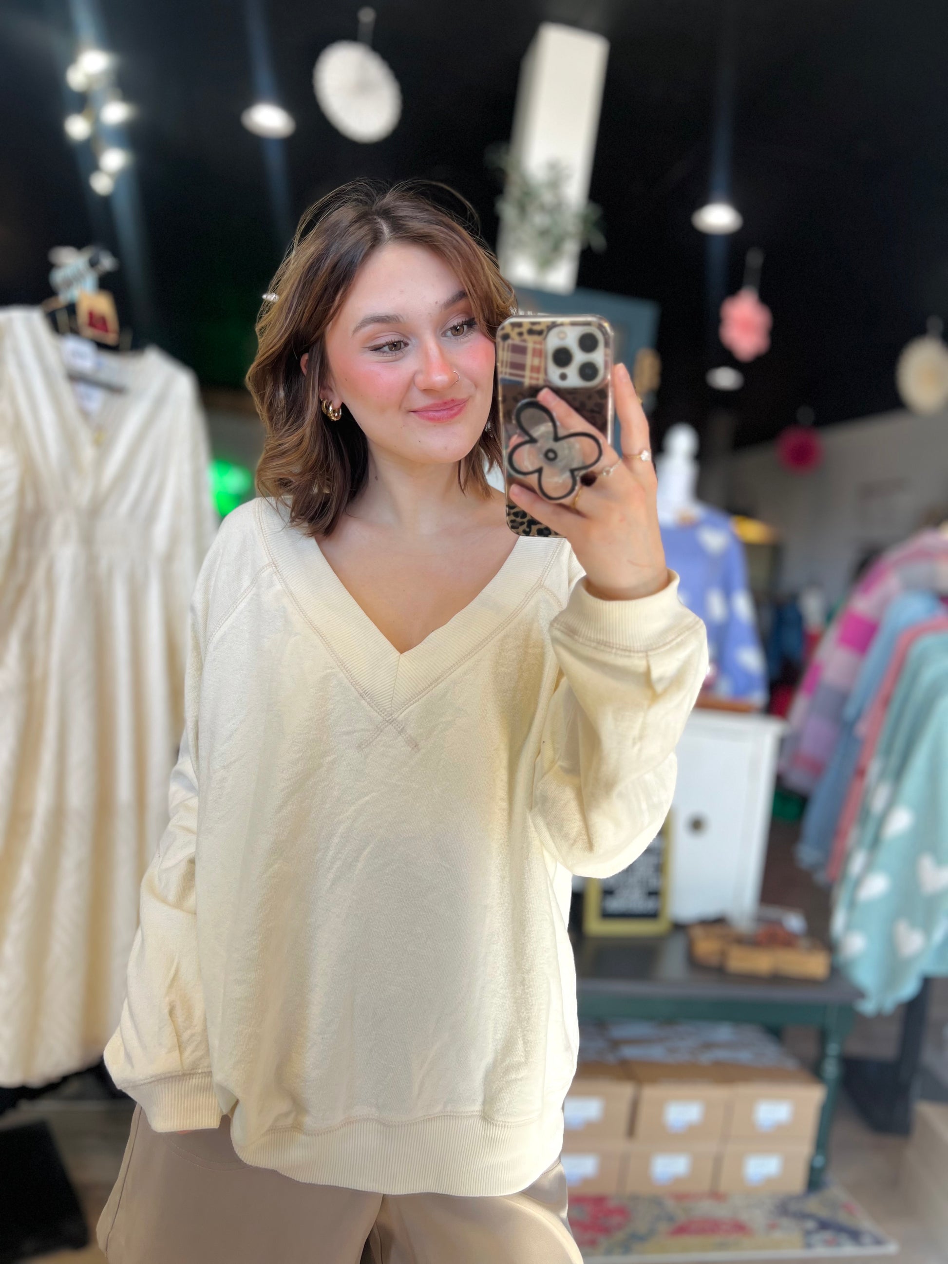 V Neck Cream Crew - L