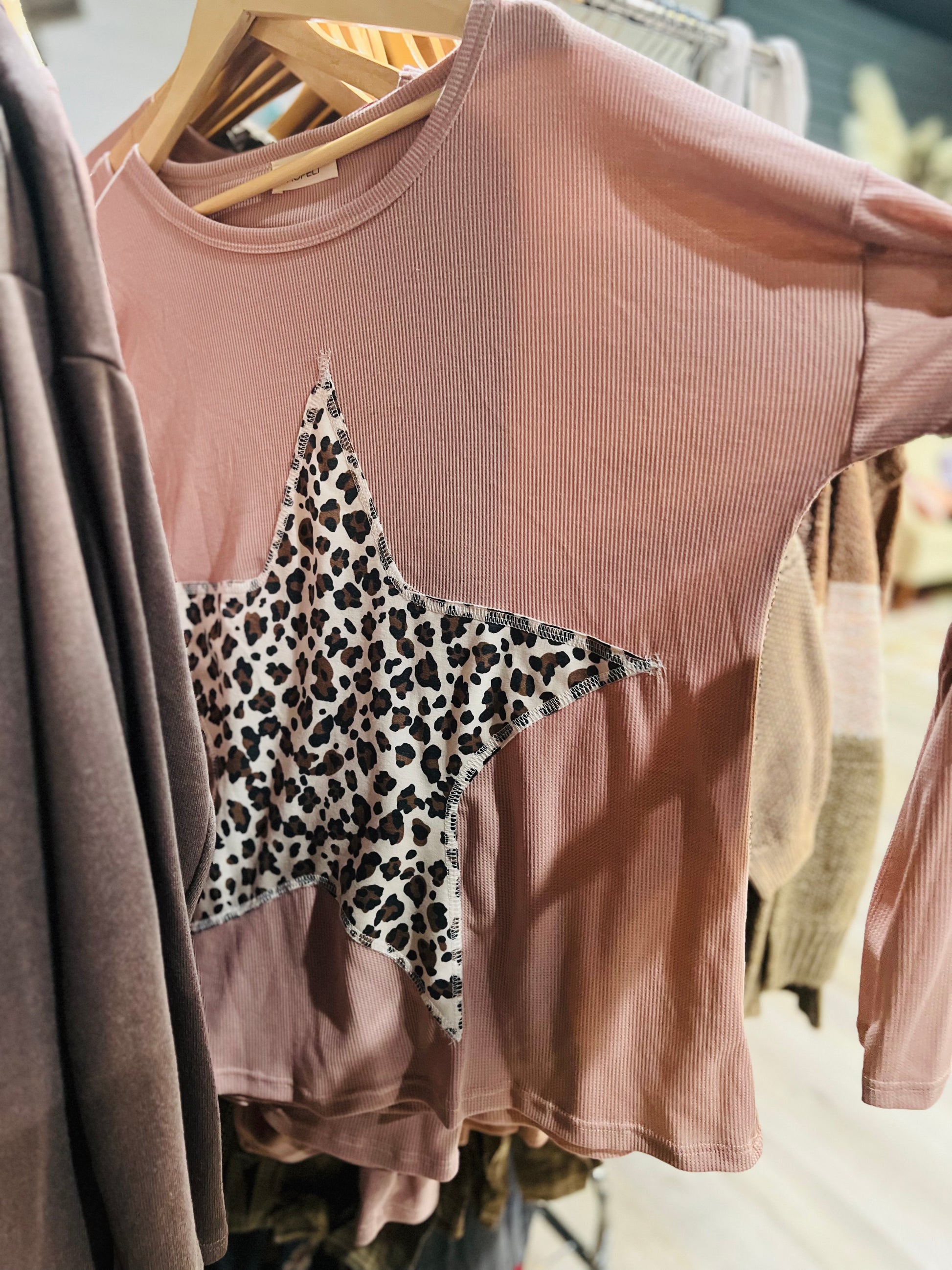 This round neck, long sleeve top (in plus size) could be worn casually with a pair of our leggings and a white tennis shoe, or easily dressed up with a pair of our gorgeous distressed jeans and our ankle booties! The animal print star patch is what MAKES the shirt!!